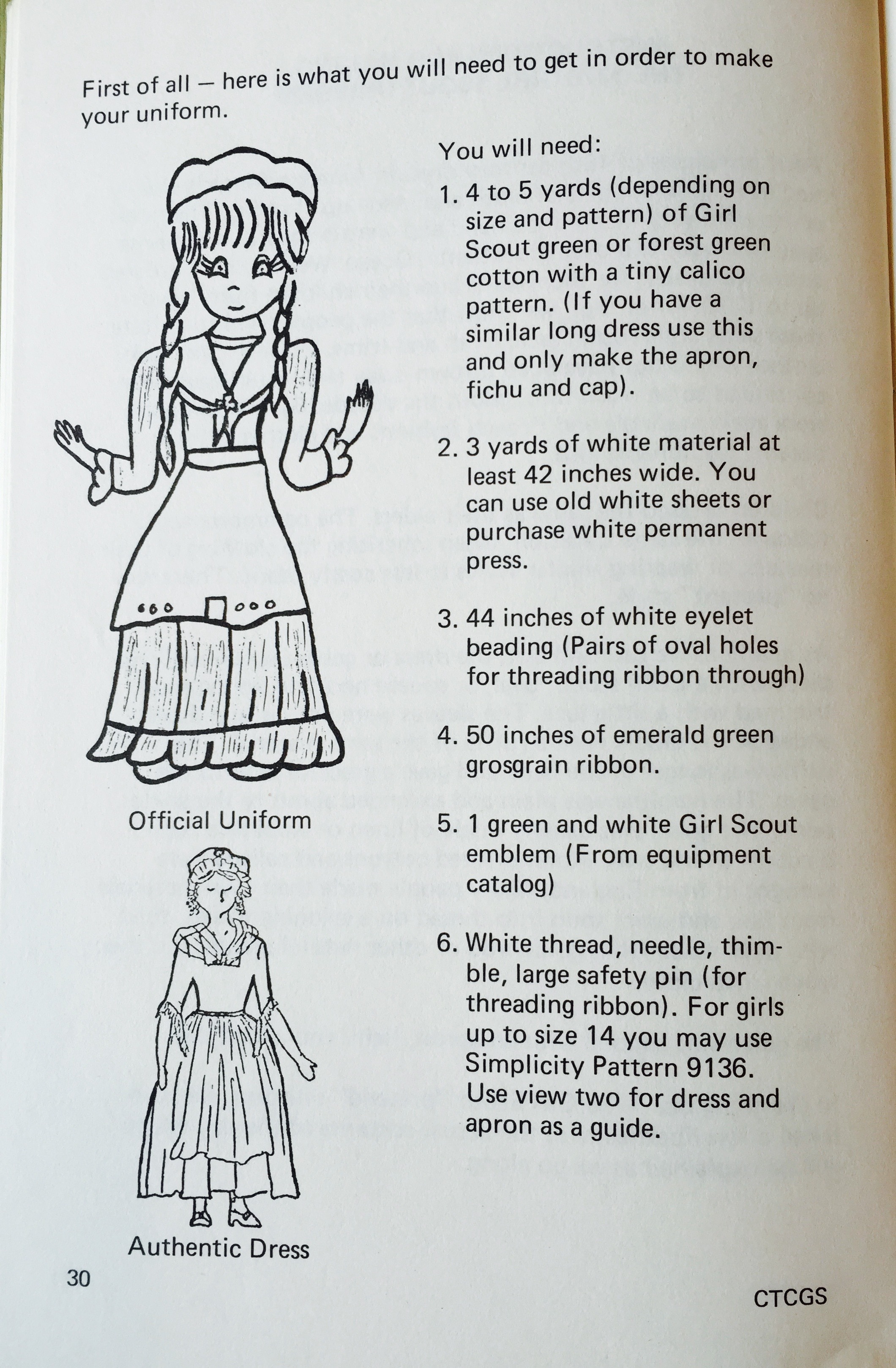 The third section contained instructions for making “the 1776 Girl Scout uniform,” which included a gown or dress, an apron, a fichu (scarf), mob cap, and shoes.