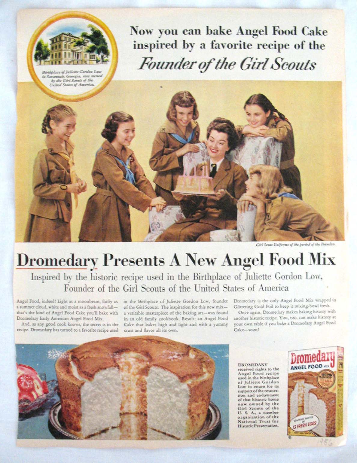 One year earlier, Helen Duprey Bullock, of the National Trust for Historic Preservation, had begun adapting “classic” cake recipes for Dromedary Heritage Series cake mixes. Not only were the recipes based on family traditions from historic American homes, but a portion of the profits went to restore the related home. Dromedary was a division of the National Biscuit Company